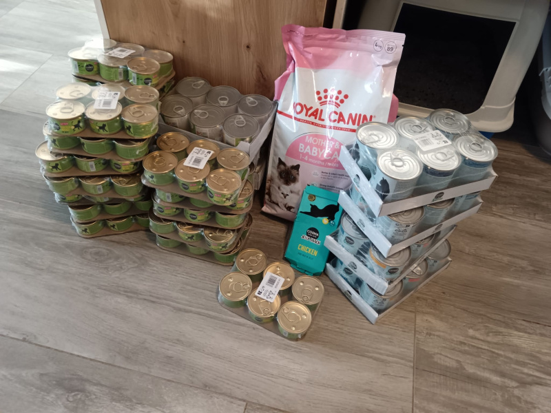 Nakonec posíláme 66,4 kg krmiva a balík hygienických prostředků! Opět jsme využili principu Dobrokupu, který umožňuje spojit jednotlivé nákupy do jednoho většího, a díky tomu jsme mohli více krmiva. Tento měsíc jsme díky Dobrokupu poslal oproti jednotlivým nákupům o 72 konzerv a kapsiček více a několik pytlů granulí, což dohromady znamená o 13,7 kg krmiva navíc.